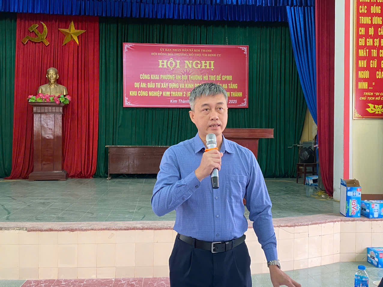 Tại hội nghị, Hội đồng bồi thường, hỗ trợ, tái định cư xã thông báo công khai phương án bồi thường, hỗ trợ diện tích đất nông nghiệp, cây cối hoa màu trên đất để GPMB khi Nhà nước thu hồi đất thực hiện Dự án đầu tư xây dựng và kinh doanh, kết cấu hạ tầng KCN Kim Thành 2 (giai đoạn 01) tại thôn Đại Tiến, xã Kim Thành. Thời gian công khai dự án từ ngày 30/10/2025 đến 30/11/2025. Danh sách phương án công khai được niêm yết tại trụ sở UBND xã Kim Thành và Nhà văn hóa thôn Đại Tiến, xã Kim Thành.